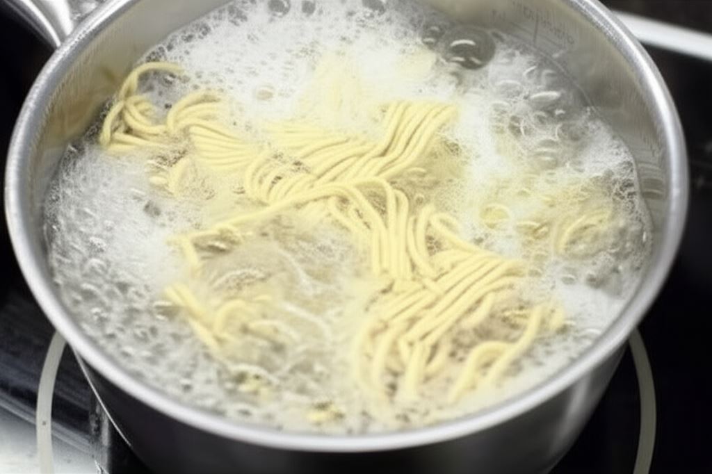 Rozpocznij przygotowanie chińskiego smażonego makaronu z kapustą od zagotowania wody w dużym garnku. Dodaj do niej 200 gramów chińskiego makaronu jajecznego i gotuj zgodnie z instrukcją, którą znajdziesz na opakowaniu. Kiedy tylko zmięknie, od razu go odcedź i odstaw na bok. Staraj się nie dopuścić do rozgotowania makaronu.