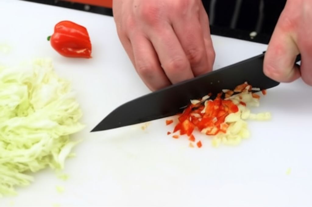 Zacznij od przygotowania warzyw. Potnij w cienkie paski połowę główki kapusty pekińskiej oraz dwie cebule dymki. Potem posiekaj papryczkę chili i 2 ząbki czosnku.
