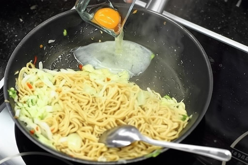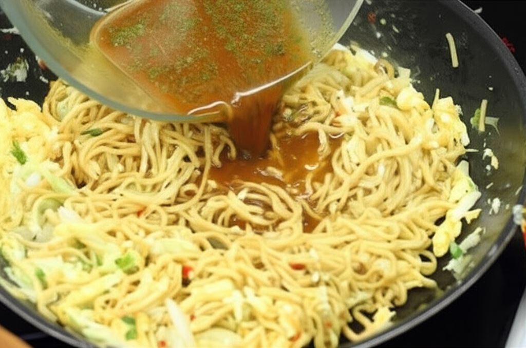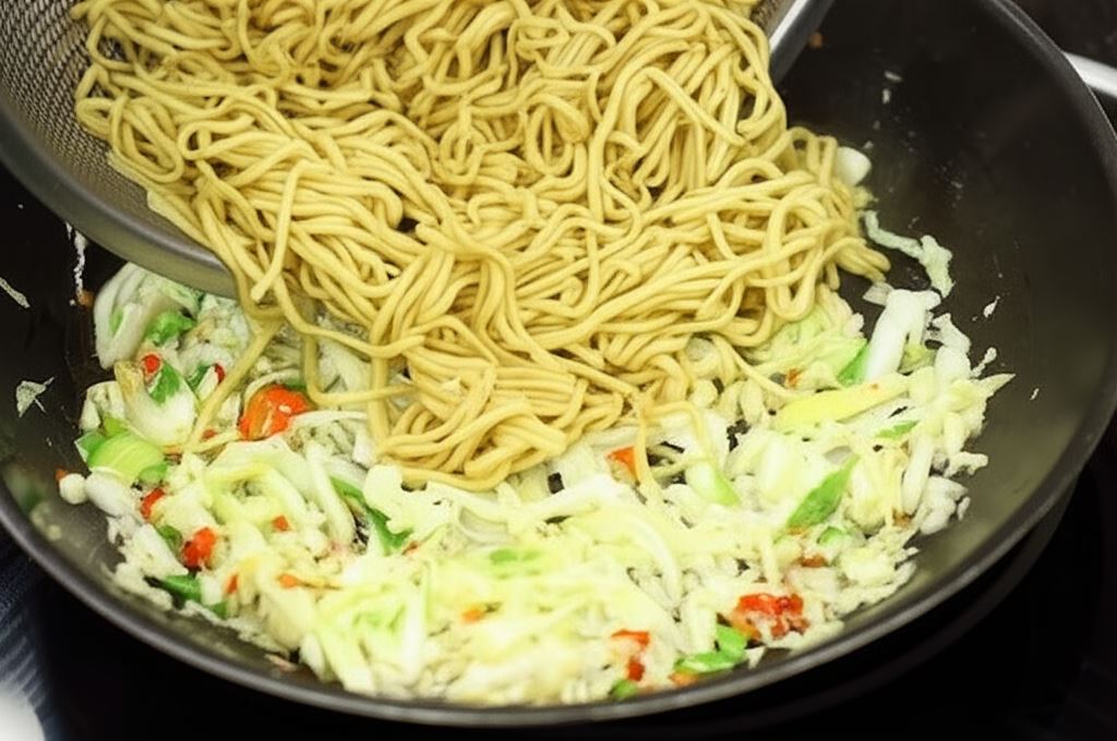 Po krótkim smażeniu dodaj do warzyw wcześniej ugotowany makaron chiński. Dokładnie połącz wszystkie składniki, mieszając je razem.