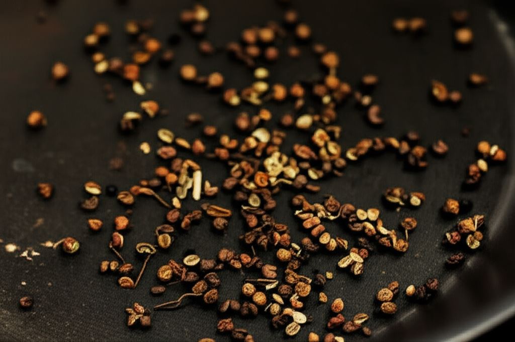 Na patelnię albo do woka wsyp rozgniecione ziarna pieprzu. Ogrzewaj, aż pieprz odda swój aromat.