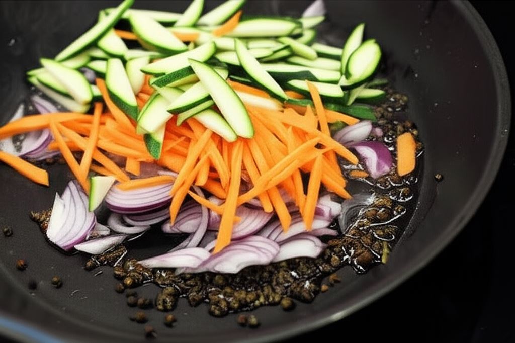 Potem wlej olej na patelnię, wsyp marchewkę, cebulę i cukinię. Przysmaż moment. Dodaj posiekany czosnek i starty imbir.