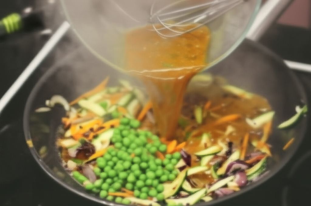 W 100 mililitrach wody rozmieszaj Fix Knorr i wlej mieszaninę na patelnię, dodaj sos sojowy, olej sezamowy oraz zielony groszek. Wszystko starannie wymieszaj i doprowadź do wrzenia.