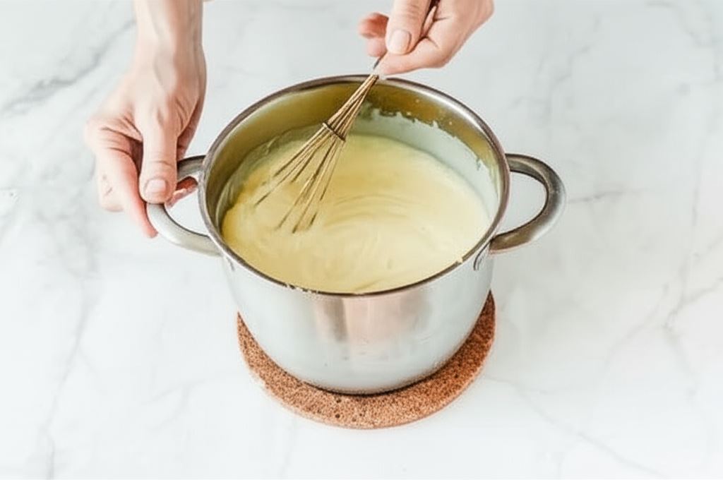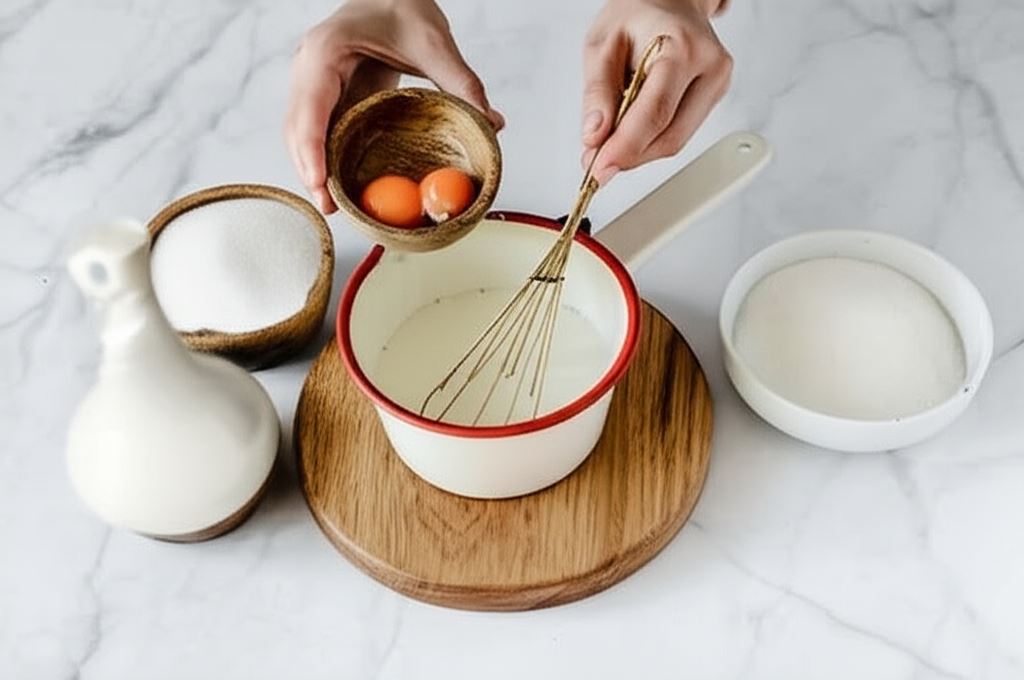 Resztę mleka doprowadzamy do wrzenia. Następnie dodajemy do niego mieszaninę z żółtkami i dokładnie mieszamy, aż masa stanie się gęsta. Odstawiamy z ognia, przelewamy do czystego pojemnika i przykrywamy folią aluminiową. Odczekujemy do ostygnięcia.
