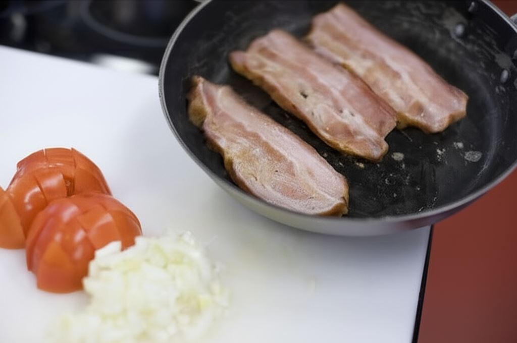 4 plastry boczku przyrumień w całości na suchej patelni – potem przełóż na papierowy ręcznik. Pomidory pokrój w grubą kostkę. Pozostały boczek podziel na paski, cebulę drobno posiekaj.