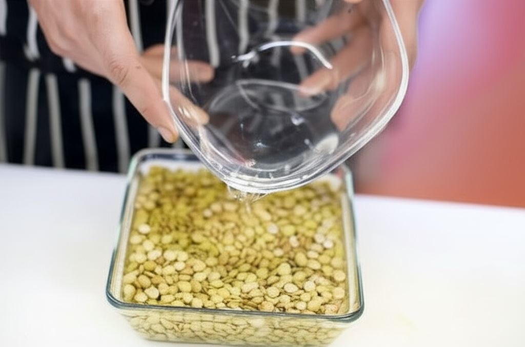 Soczewicę opłucz i zamocz zostawiając ją w zimnej wodzie przez około 1 godzinę. Następnie przełóż nasiona do garnka, zalej dwoma szklankami wody, dodaj sól i gotuj na wolnym ogniu przez około 30 minut.
