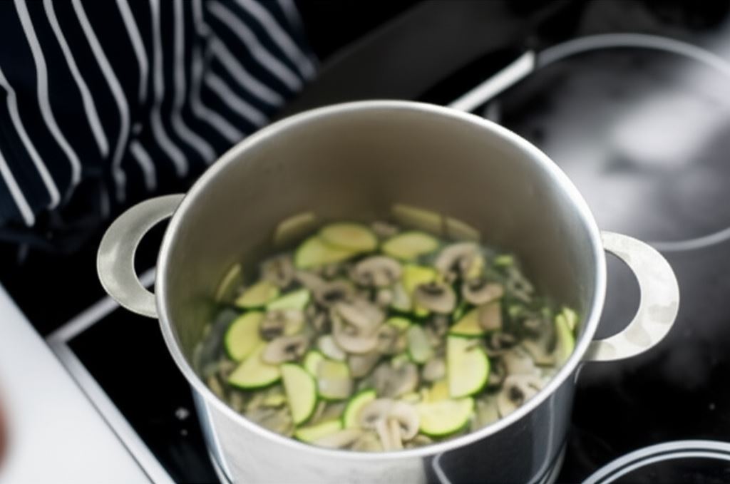W rondlu zrumień cebulę, wsyp pieczarki i cukinię. Wszystko zalej przygotowanym Fixem Knorr, zagotuj, po czym zredukuj ogień i gotuj przez kilka minut.