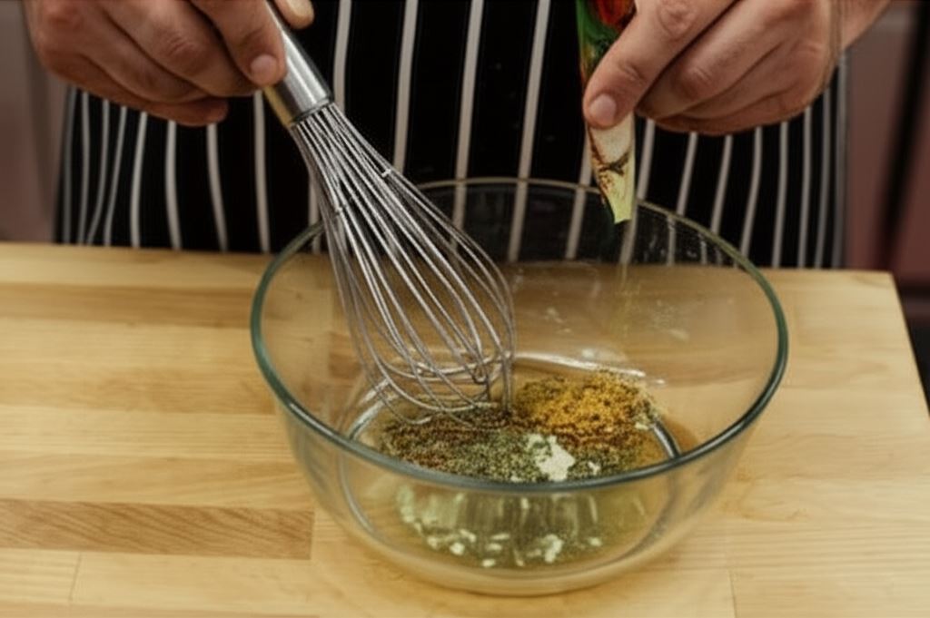W dużej misce sporządź marynatę, mieszając ½ zawartości opakowania przyprawy Knorr, musztardę, olej roślinny, posiekany czosnek, majeranek oraz tymianek.