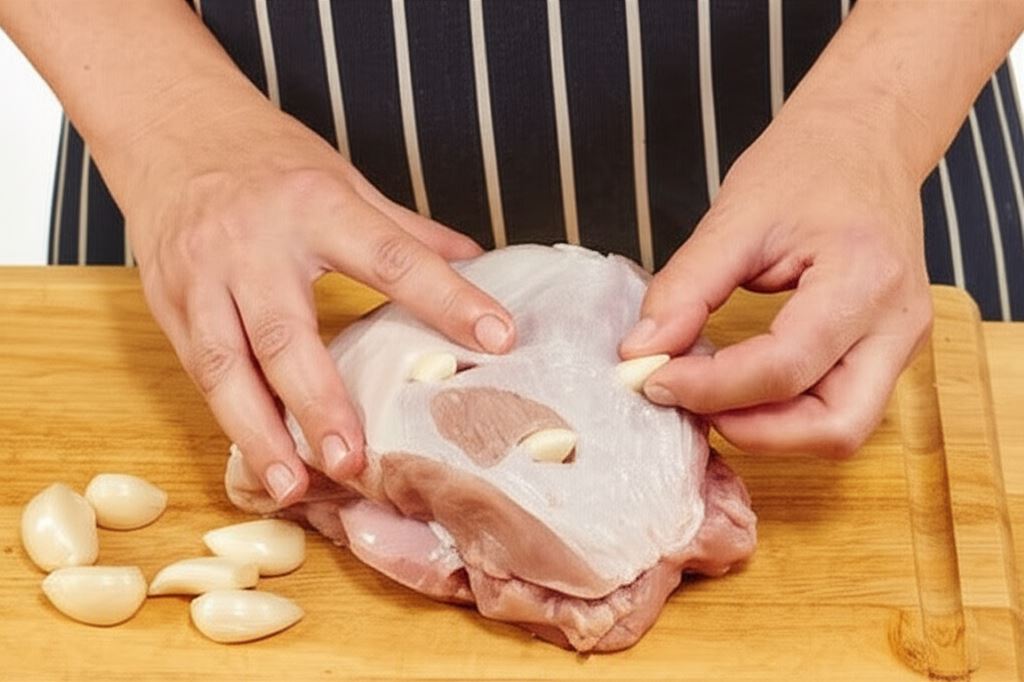 Rozgrzej piekarnik do 220°C. Rozdziel czosnek na ząbki i obierz. Nożem wykonaj wgłębienia w mięsie. Wypełnij je ząbkami czosnku.