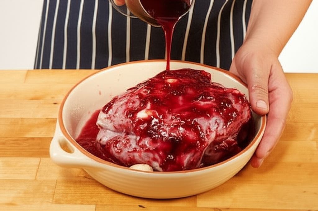 Wymieszaj Przyprawę do karkówki Knorr z oliwą, tymiankiem i dżemem. Posmaruj dokładnie mięso. Umieść w naczyniu do zapiekania. Dodaj wino i 100 ml wody.