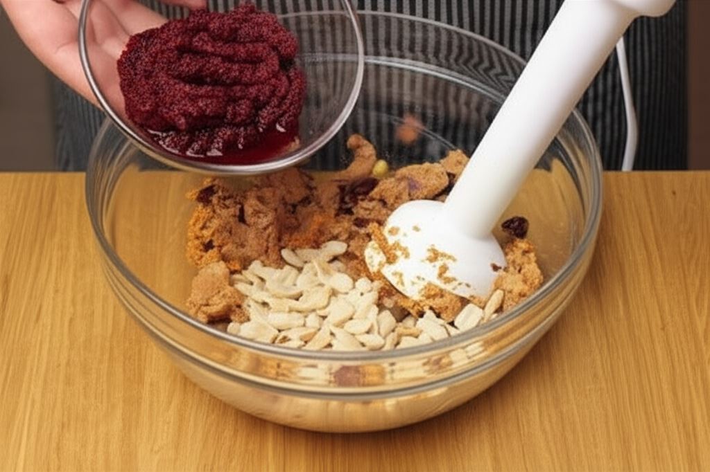 Do miski wlej 50 mililitrów wody, dodaj również po 50 gramów orzeszków ziemnych i buraków ćwikłowych. Teraz potrzebujesz blendera – rozdrobnij nim wszystkie składniki znajdujące się w misce. Możesz również zastosować mikser. Wystarczy, że przełożysz zawartość miski do kielicha. Masa powinna mieć taką konsystencję, z której można uformować placki burgerowe.