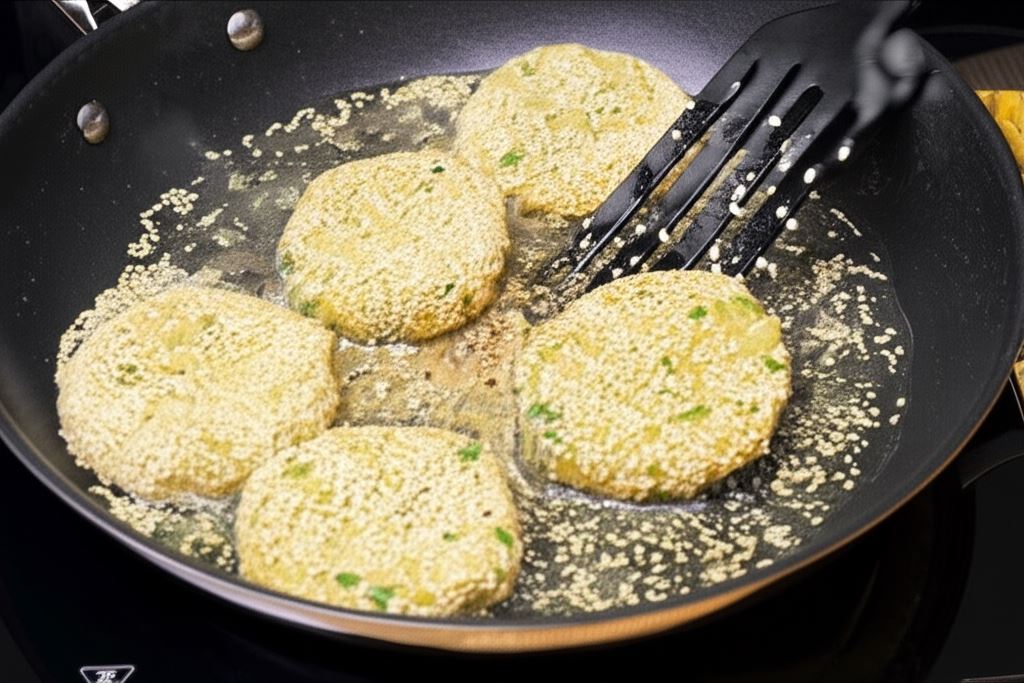 Potem przygotuj talerz i wsyp na niego 50 gramów nasion sezamu. Teraz obturlaj w nich starannie każdy z kotletów z cieciorki. W międzyczasie możesz podgrzać na patelni 80 mililitrów oleju. Kiedy będzie już odpowiednia do smażenia, umieść na niej tyle kotlecików, aby wszystkie się pomieściły i miały wokół trochę przestrzeni. Smaż je przez parę minut, aż uzyskają delikatnie złocisty kolor.