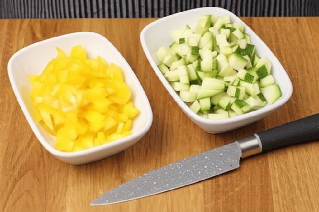 Rozpocznij przygotowanie kotletów z mięsa mielonego i cukinii od warzyw. Pokrój paprykę oraz cukinię w małą kostkę.