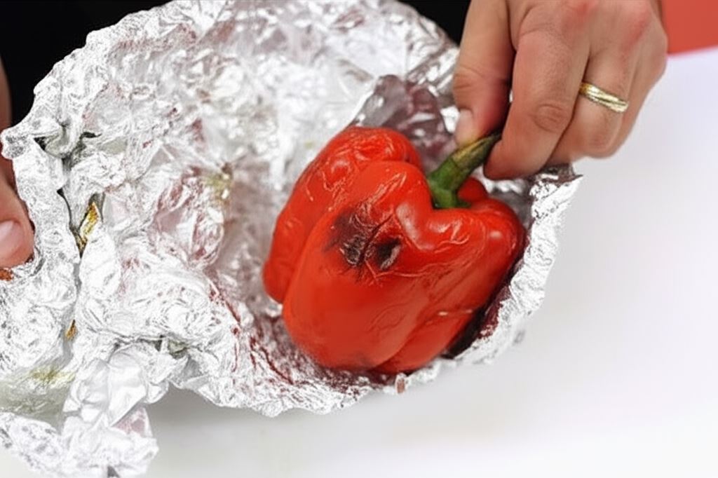 Czerwoną paprykę owiń w folię aluminiową, piecz przez około 20 minut w piekarniku w temperaturze 200 °C. Po wystudzeniu zdejmij skórkę, usuń nasiona i pokrój na drobne kawałki.