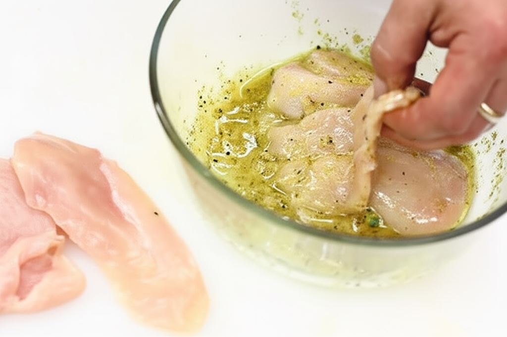 Filety pokrój na cienkie plastry o grubości 1 cm i roztłucz tłuczkiem. Mięso obtocz w przygotowanym marynacie.
