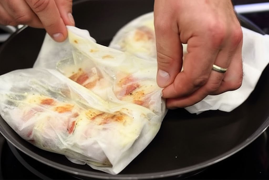 Roladki włóż do torebki do smażenia, umieszczając po cztery sztuki, i smaż około 12 minut, obracając torebkę od czasu do czasu. Roladki serwuj oblane syropem balsamicznym, na białym ryżu.