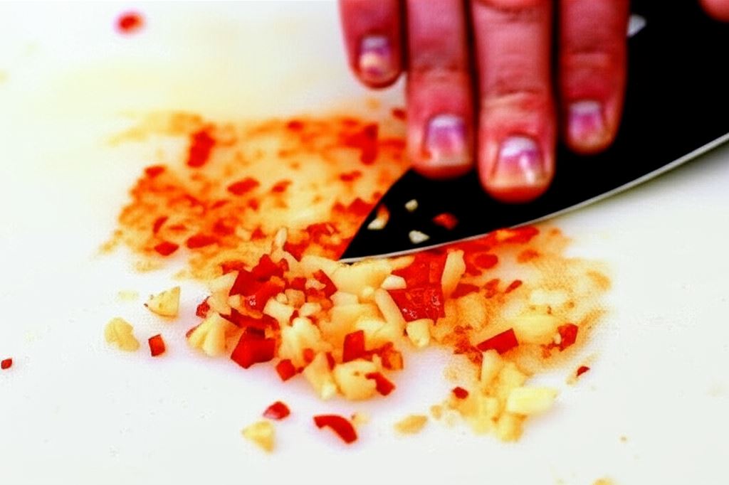 Czosnek i papryczkę chili posiekaj drobno i rozetrzyj ostrzem noża, aż uzyskasz pastę.