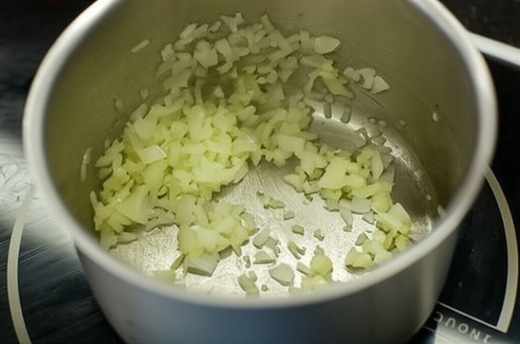 Na rozgrzanej oliwie w garnku zrumień drobno posiekaną cebulę i czosnek.
