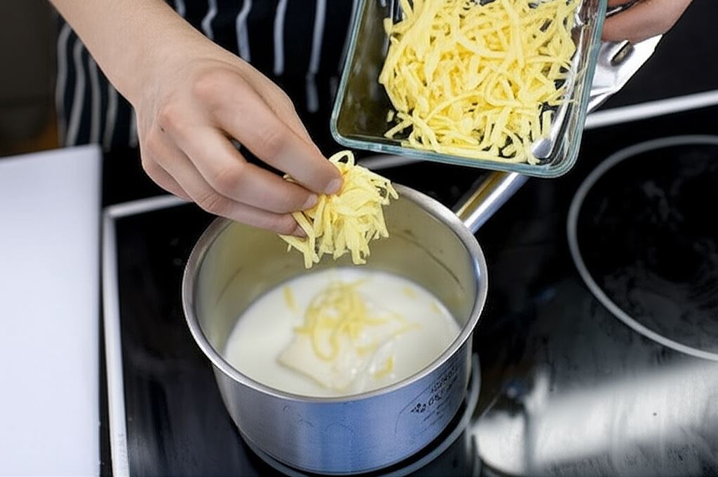 W garnuszku ogrzej mleko, wsyp serek topiony i rozpuść go mieszając. Potem dodaj starty ser i również go rozpuść.