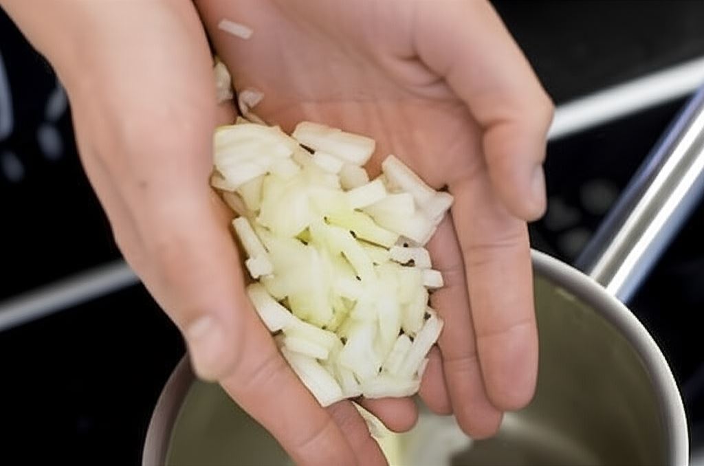 Cebulę posiekaj w drobną kostkę. W rondelku roztop masło i zeszklij cebulę. Serek podziel na mniejsze kawałki.