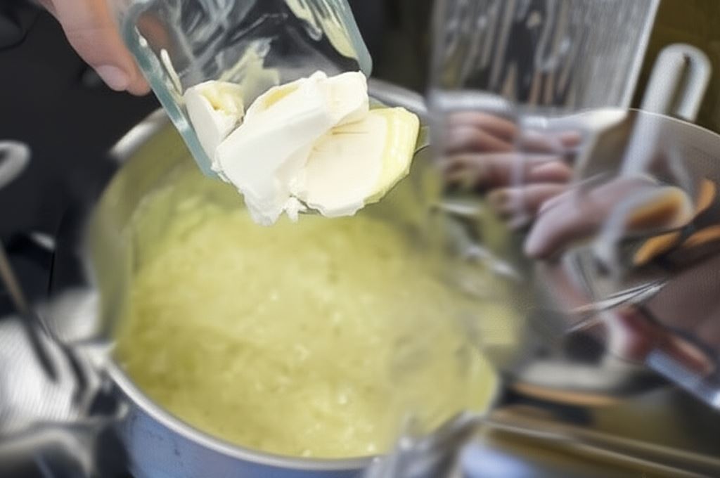 Dodaj łyżkę mąki, zamieszaj i pogrzej jeszcze moment. Potem dolej mleko, śmietanę i wrzuć kostkę Knorr. Wszystko doprowadź do wrzenia.