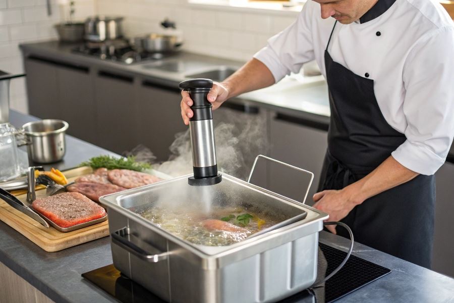 Gotowanie sous vide wymaga kilku podstawowych elementów wyposażenia. Cyrkulatory immersyjne to urządzenia, które utrzymują precyzyjną temperaturę wody i zapewniają jej równomierny obieg. Profesjonalne modele oferują kontrolę z dokładnością do 0,1°C, a najnowsze wersje z 2025 roku posiadają funkcje sterowania przez aplikację mobilną. Równie istotne są worki próżniowe – muszą być wykonane z materiałów bezpiecznych dla żywności i wytrzymałych na wysokie temperatury. Do ich zamknięcia potrzebne jest urządzenie do pakowania próżniowego, które usuwa powietrze i szczelnie zgrzewa worek.