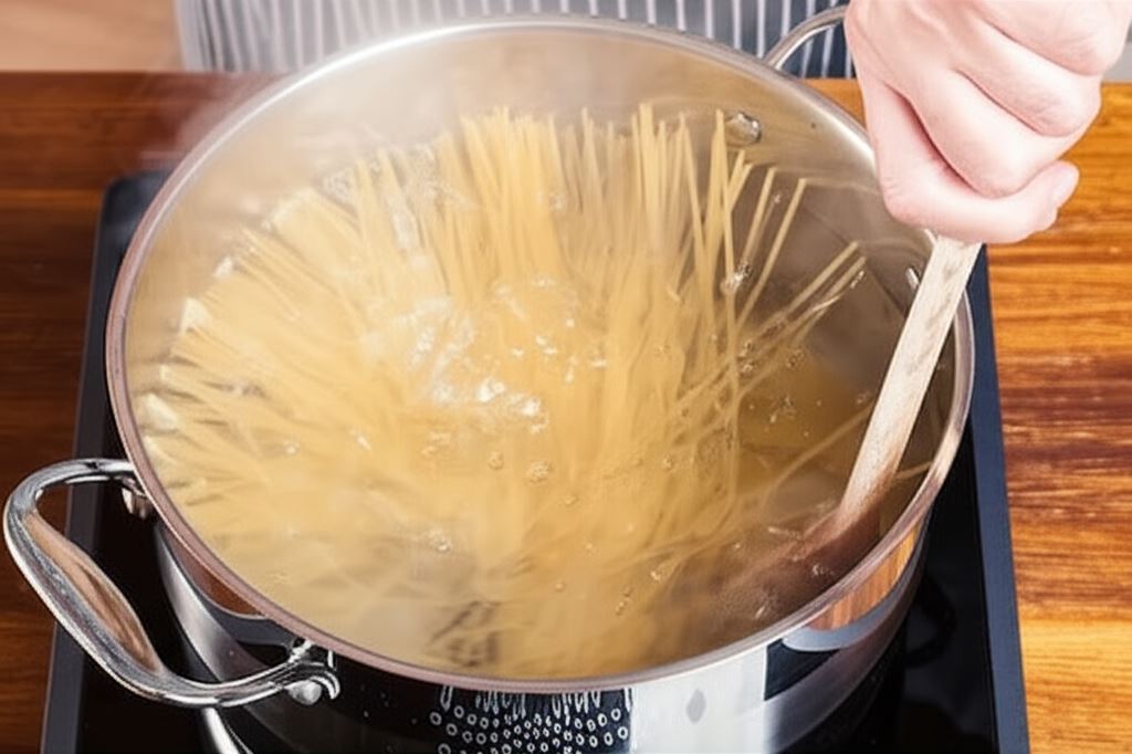 Makaron spaghetti ugotuj w osolonej wodzie zgodnie z instrukcją producenta umieszczoną na opakowaniu. Staraj się przygotować go al dente, czyli tak, by nie był zbyt miękki, ale również nie za twardy. Zachowaj niewielką ilość (np. pół szklanki) wody po gotowaniu makaronu. Kiedy będzie już ugotowany, odcedź go i odstaw na bok.