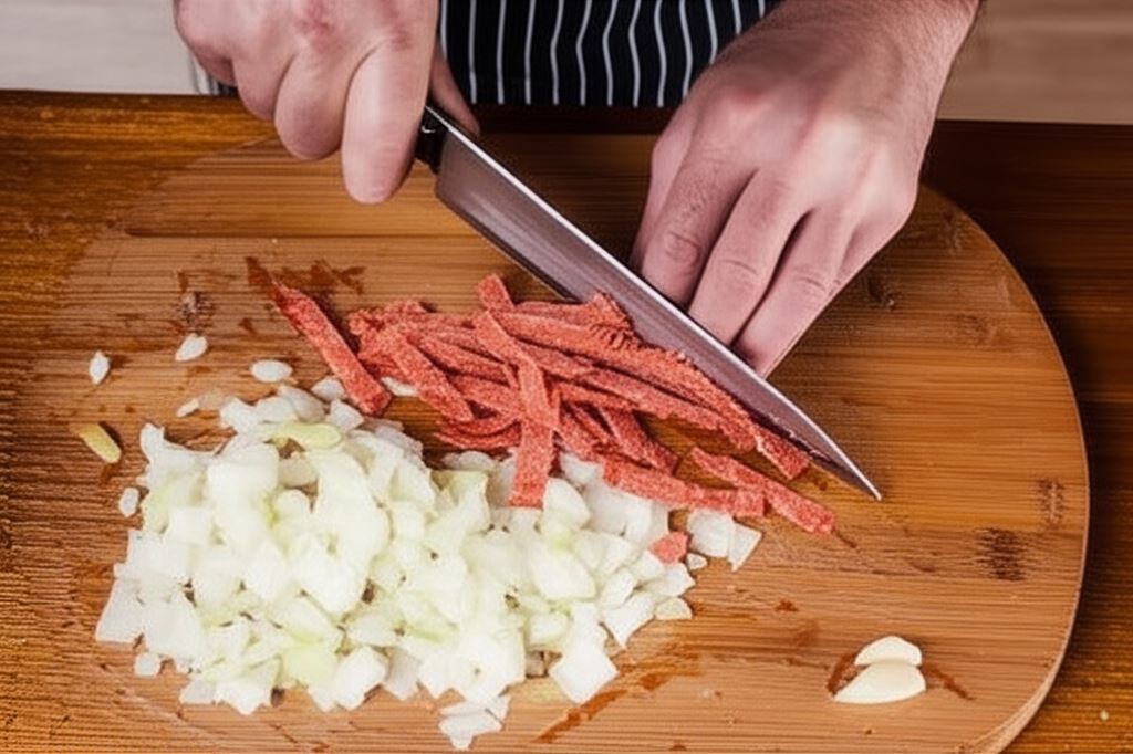 Potnij 200 gramów kiełbasy pepperoni na cienkie paski. Potem obierz i posiekaj cebulę oraz 2 ząbki czosnku.