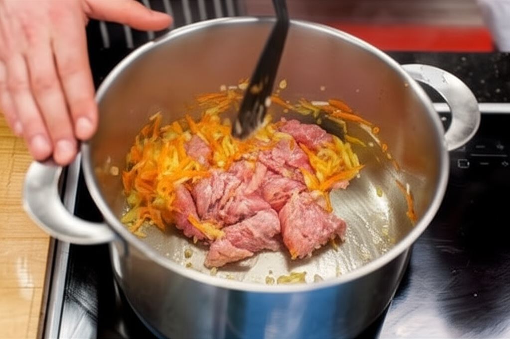 Cebulę posiekaj w małą kostkę, marchew zetrzyj na tarce, całość podsmażaj. Dodaj mięso i smaż je razem z warzywami, dopóki nie będzie suche.