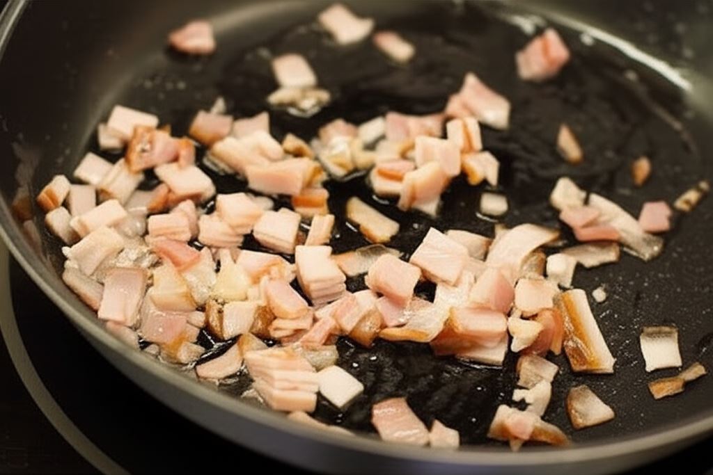 Podsmaż na patelni boczek pokrojony w kostkę.