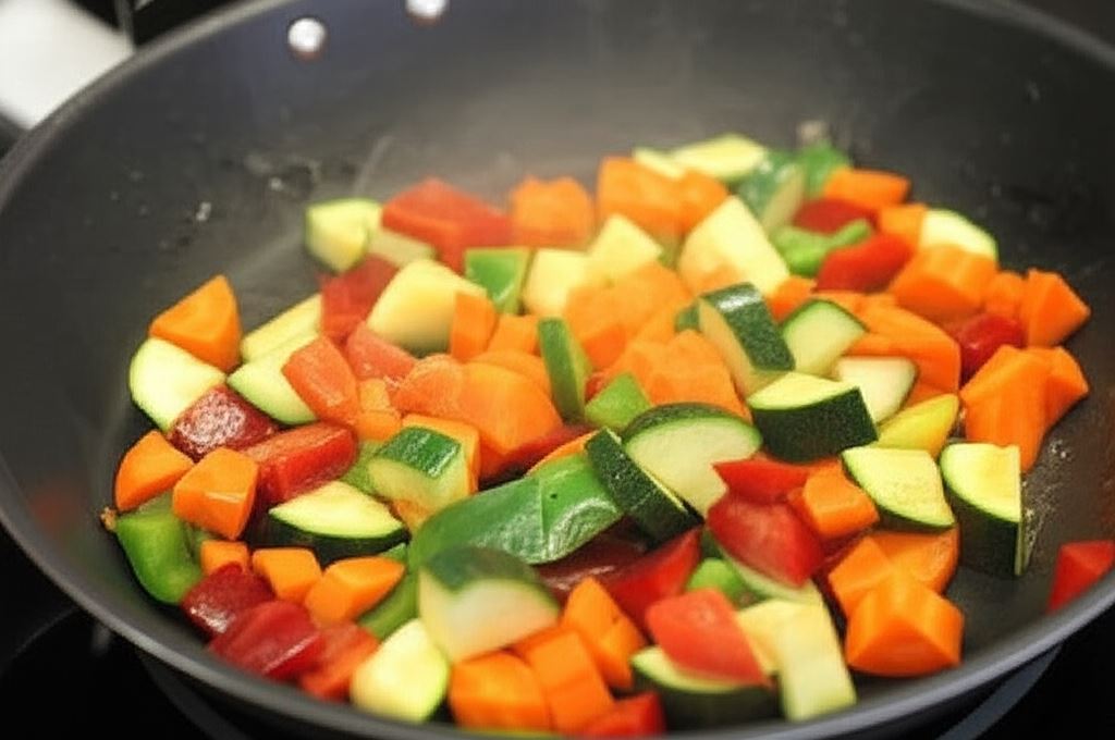 Podsmaż marchew, cukinię i paprykę na rozgrzanym tłuszczu.