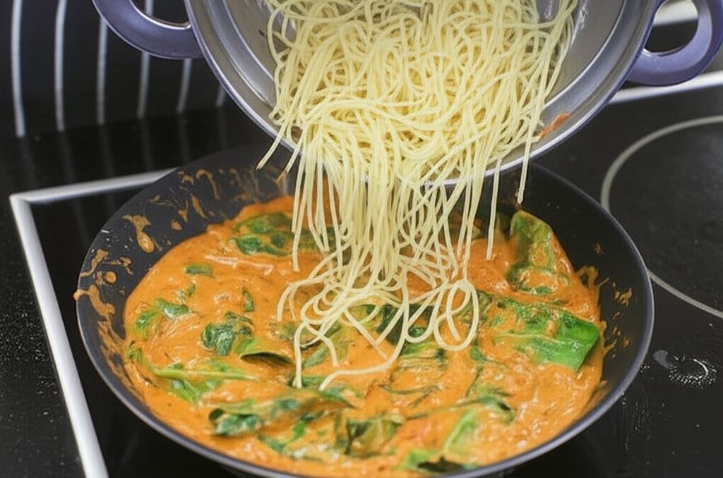 Tajemnica tego dania tkwi w aromatycznym sosie na bazie cebuli, czosnku i soczystych pomidorów z puszki, wzbogaconym kremową śmietaną i przyprawami Knorr. Gdy dodasz do niego świeży lub mrożony szpinak, całość nabierze niepowtarzalnego charakteru i apetycznego koloru. Makaron otulony tym aksamitnym sosem to prawdziwa uczta dla podniebienia!