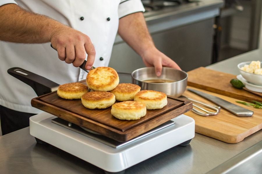 Wskazówka eksperta: Syrniki o wadze 60 gramów najlepiej zachowują balans między chrupiącą skórką a delikatnym, wilgotnym wnętrzem – to optymalna wielkość dla domowych przygotowań.