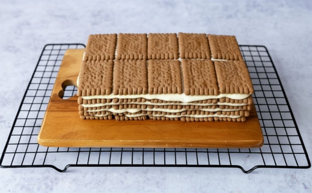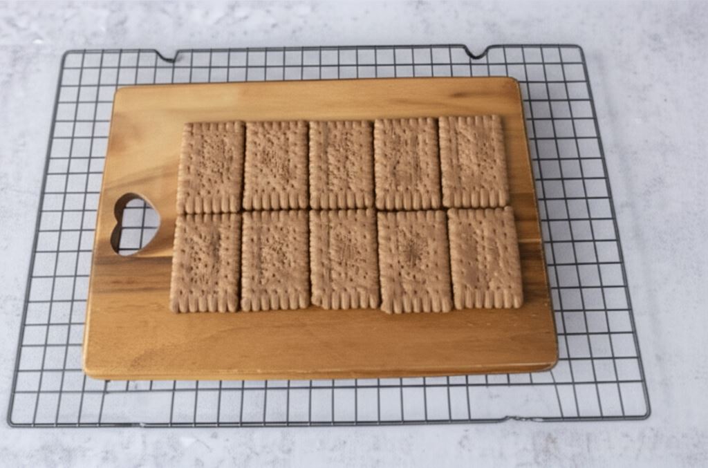 Na desce ułożyć pierwszą warstwę herbatników (5 szt. x 2 szt.).