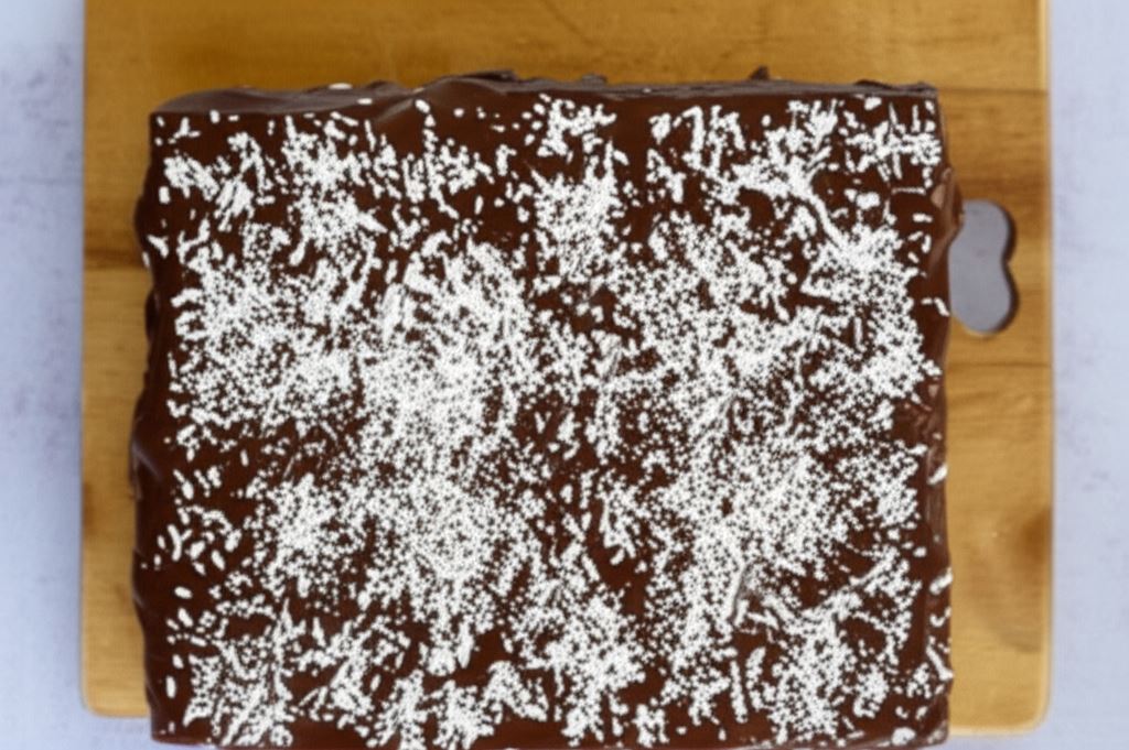 Roztopić masło wraz z czekoladą deserową. Powstałą polewą oblać ciasto. Oprószyć wiórkami kokosowymi i wstawić do lodówki na kilka godzin do schłodzenia.