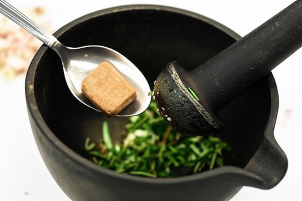 W moździerzu utrzyj kostkę Knorr razem z czosnkiem, pieprzem oraz posiekanymi ziołami.