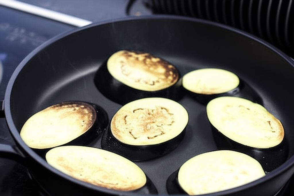 Umieść bakłażana pokrojonego w plastry na patelni bez tłuszczu. Smaż po 3 minuty z każdej strony. Po usmażeniu poczekaj aż ostygnie i pokrój w grube paski o wielkości podobnej do frytek.