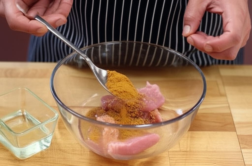 Schab potnij na grube paski i posyp hojnie Przyprawą do wieprzowiny Knorr, która nada daniu właściwego smaku i sprawi, że mięso pozostanie soczyste. Wsyp starty imbir i 2 łyżki oleju.
