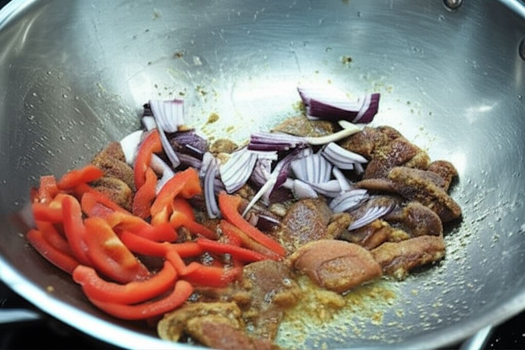 Na rozgrzanej patelni podsmażaj mięso z każdej strony, po czym dodaj paprykę pokrojoną w grube paski i cebulę pokrojoną w krążki. Smaż moment, aż cebula stanie się szklista. Ryż przygotuj według instrukcji producenta.