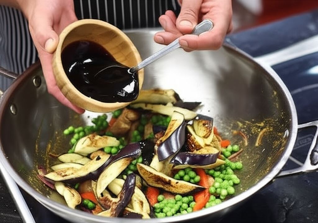 Dorzuć bakłażana, groszek i sos Hoisin. Na końcu smażenia wsyp listki kolendry. Wszystko starannie wymieszaj potrząsając składnikami w sosie. Przygotowaną wieprzowinę serwuj z ryżem.