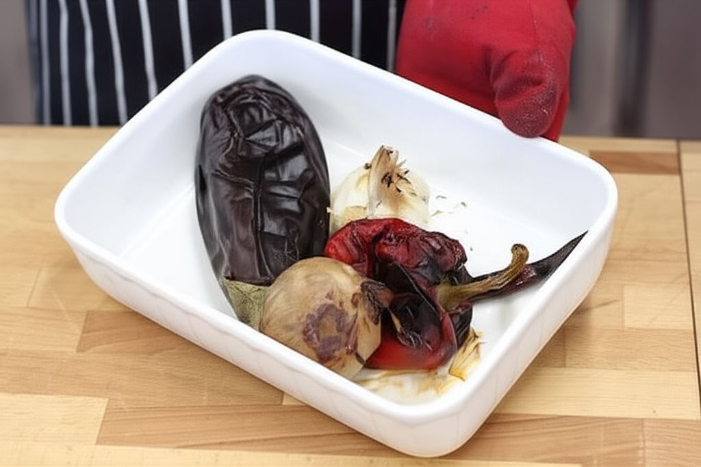 Bakłażana, paprykę, cebule, chilli i czosnek umieść w rozgrzanym piekarniku i piecz w temperaturze 190°C około 20 minut. Upieczone warzywa włóż do woreczka foliowego, zamknij i pozostaw do wystygnięcia.
