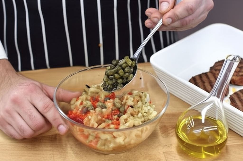 Schłodzone warzywa obierz, wytnij gniazda nasienne i bardzo drobno posiekaj w kostkę, przypraw do smaku resztą Przyprawy do mięs, posiekanymi kaparami oraz niewielką ilością oliwy.