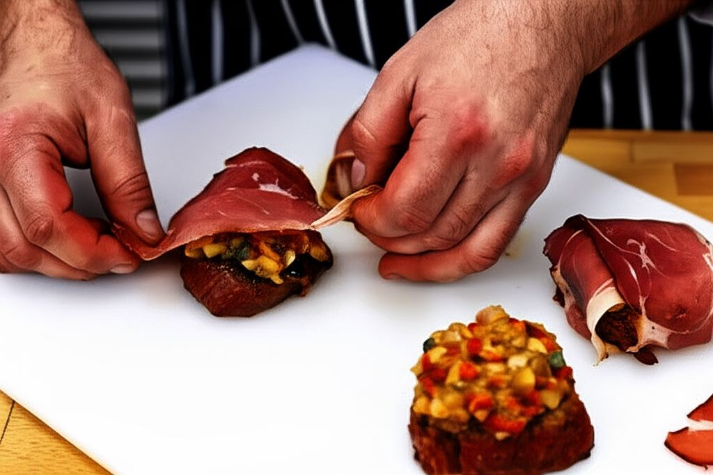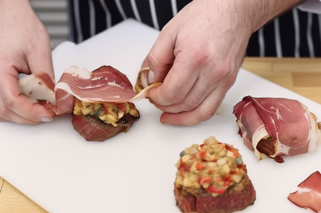 Soczyste steki z polędwicy wołowej w towarzystwie aromatycznych, pieczonych warzyw to prawdziwa uczta dla podniebienia. Delikatne mięso otulone chrupiącą szynką i przykryte warstwą rozpuszczonego sera tworzy harmonijne połączenie smaków i tekstur. Sekret tego dania tkwi w odpowiednim przygotowaniu składników – bakłażan, papryka, cebula i czosnek upieczone do perfekcji nadają całości głębi smakowej, a marynata z oliwy i przypraw do mięs podkreśla naturalny smak wołowiny.