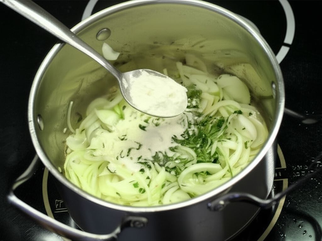 Cebulę pokrój w piórka, a czosnek drobno posiekaj, następnie przesmaż je razem w garnku. Wsyp resztę mąki, posiekaną natkę i rozmaryn.