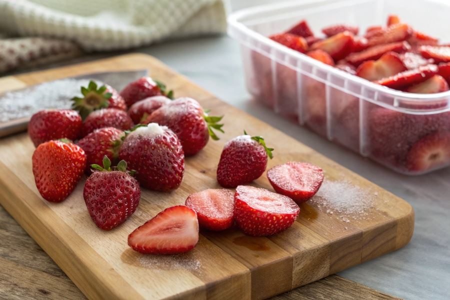 Mrożenie w cukrze wymaga zachowania odpowiednich proporcji: na 1 kg truskawek stosuje się 200-300 g cukru. Pokrojone owoce wymieszaj z cukrem, odczekaj 15-20 minut aż puszczą sok, a następnie przełóż do pojemników i zamroź. Ta metoda świetnie sprawdza się do truskawek przeznaczonych do ciast i deserów.