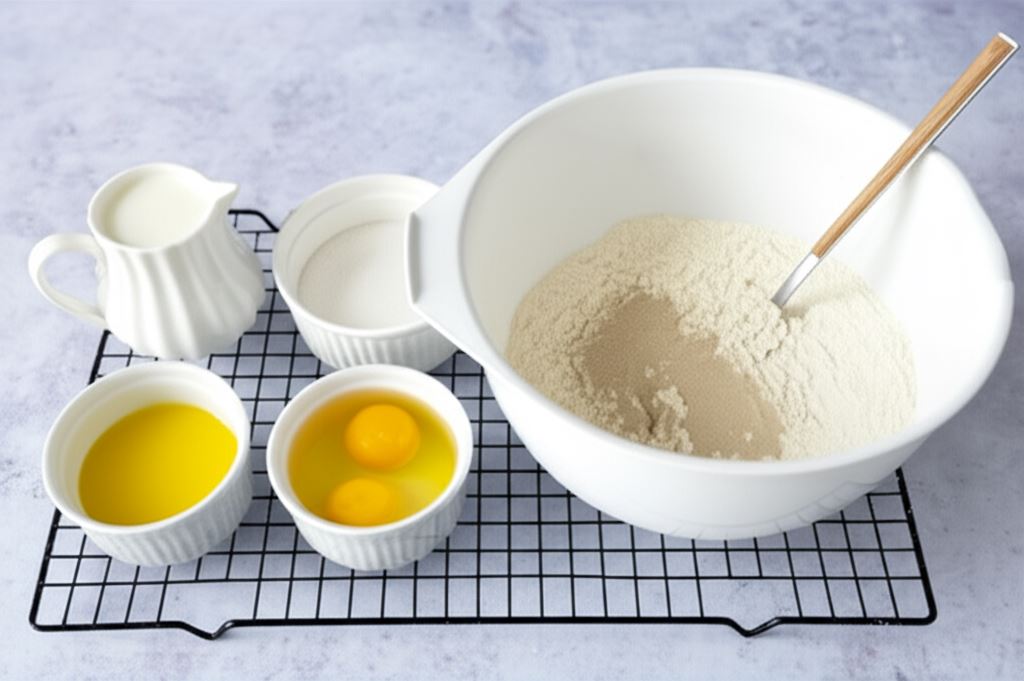 Przesiej mąkę, wsyp drożdże, sól, cukier, wbij jajka, wlej roztopione masło i ciepłe mleko.