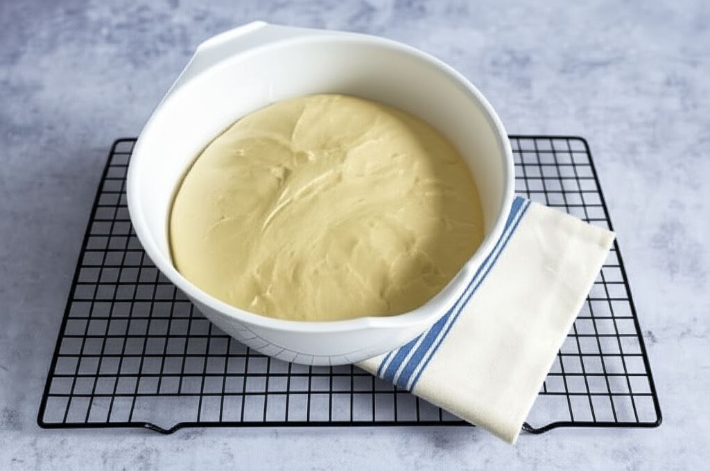 Całość wyrabiaj przez ok. 10-15 minut. Nakryj ściereczką i pozostaw do wyrośnięcia na ok. 1,5 h. Wyrośnięte ciasto pozbaw powietrza, krótko wyrabiaj i rozwałkuj na formę prostokąta.