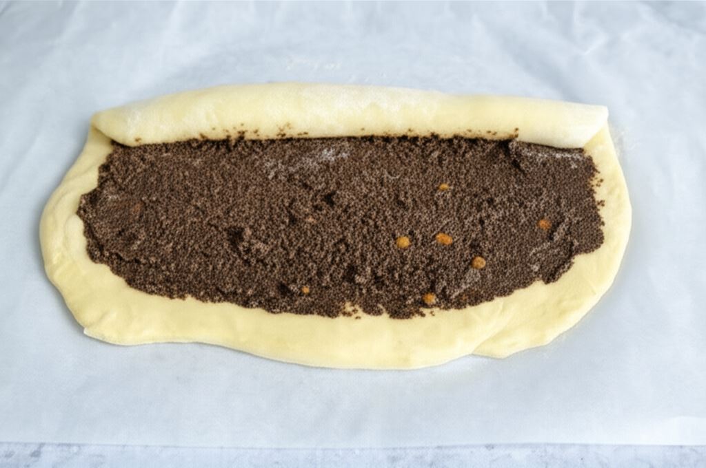 Na rozwałkowane ciasto nałóż masę makową (pozostawiając margines przy brzegach) i zwiń w kształt rolady.