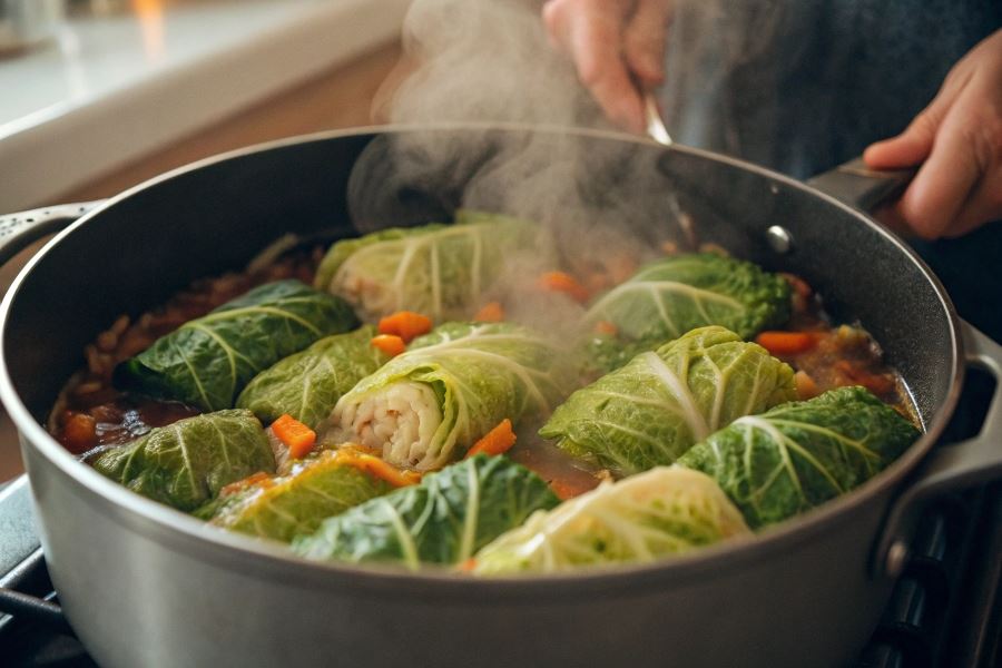 Podlewanie wykonujemy co 15-20 minut, używając bulionu warzywnego lub wywaru z kości. Kluczowe jest, aby nie mieszać gołąbków bezpośrednio, a jedynie delikatnie potrząsać rondlem lub obracać pojedyncze sztuki przy pomocy łyżki. Pod koniec duszenia można zagęścić sos łyżką mąki wymieszanej z zimną wodą.