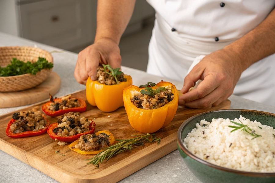 Blanszowanie papryki przed faszerowaniem znacząco skraca czas pieczenia i zapewnia idealną konsystencję. Zanurz przekrojone i oczyszczone z nasion papryki we wrzątku na 2-3 minuty, następnie natychmiast schłodź w zimnej wodzie.