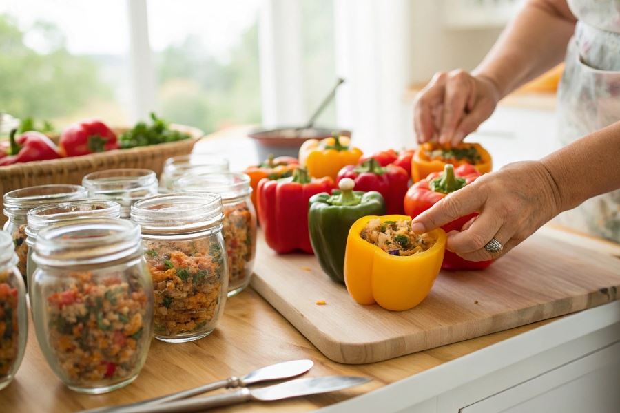 Przed faszerowaniem paprykę należy odpowiednio przygotować. Proces blanszowania jest kluczowy – zanurz paprykę w gorącej wodzie na 2-3 minuty, a następnie natychmiast schłodź w zimnej wodzie z lodem. Ta technika pozwala zachować jędrność papryki podczas pasteryzacji i zapobiega jej nadmiernemu mięknięciu. Pamiętaj, by wcześniej usunąć gniazda nasienne i dokładnie oczyścić wnętrze każdej papryki.